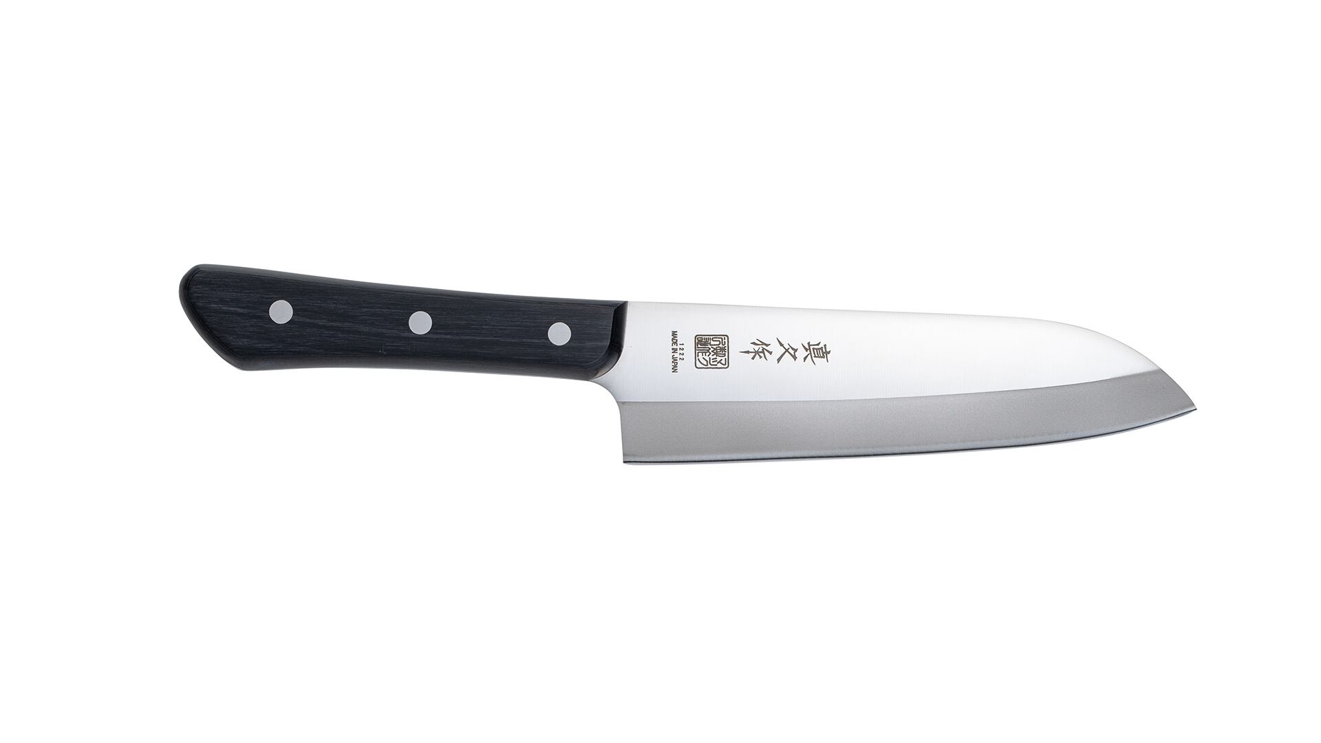 全長:30cm 刃渡り:17cm 刃厚:2mm 重量:150g 刃:高炭素特殊鋼 柄:積層合板 ■ 特徴 野菜・肉・魚に万能な真久作三徳包丁。高炭素特殊鋼を本刃付けで鋭い切れ味。握りやすく疲れにくい柄で錆びに強く手入れも簡単、米誌で最高評価。