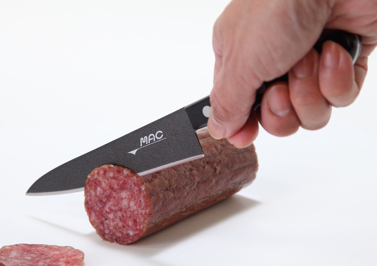 MAC ノンスティックシリーズのペアリングナイフは、フッ素樹脂加工による“張り付きにくさ”と、MAC独自の鋭い刃付けを兼ね備えた、皮むき・細工切りに最適な一本です。