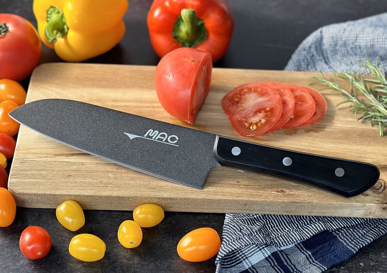 MAC ノンスティックシリーズの三徳包丁は、フッ素樹脂加工による“張り付きにくさ”と、MAC独自の鋭い刃付けを融合した、家庭料理に最適な万能包丁です。